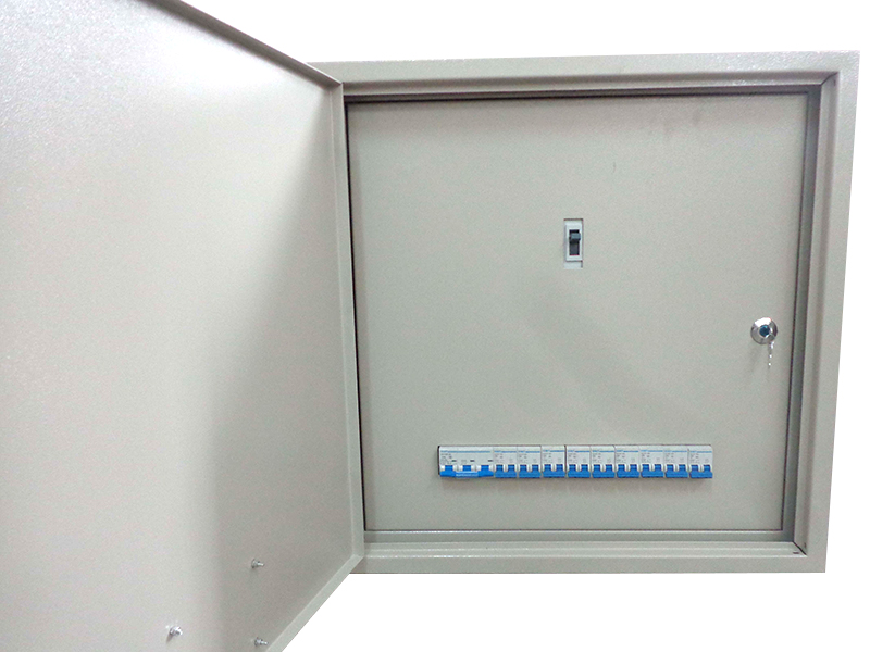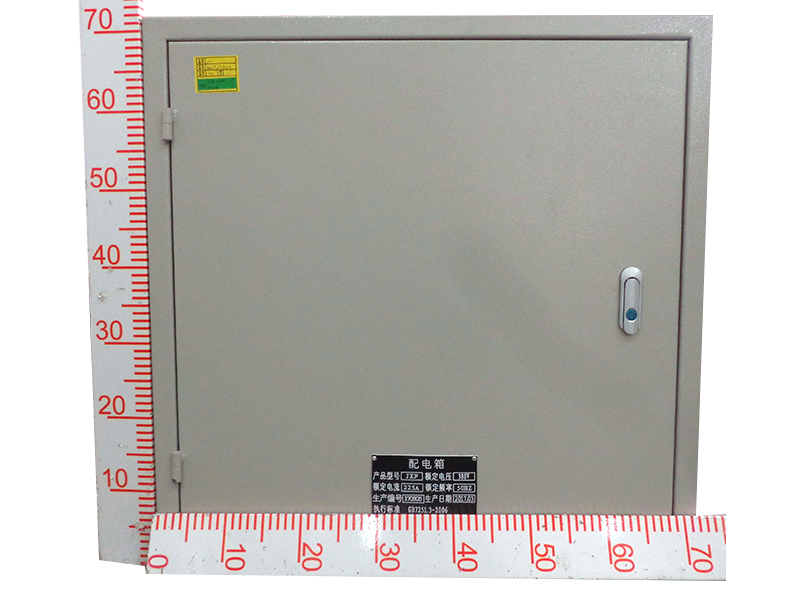 箱体采用厚冷轧钢板经弯制、焊接而成,在挡板门对应开关处开有方孔,打开门可操作开关手柄。箱体内带电部分均遮盖于挡板门内部。主开关安装在箱内上部安装框上。箱内下部设有安装导轨,导轨上装有分回路小型断路器。箱体下设有敲落孔,便于与外部导线连接。